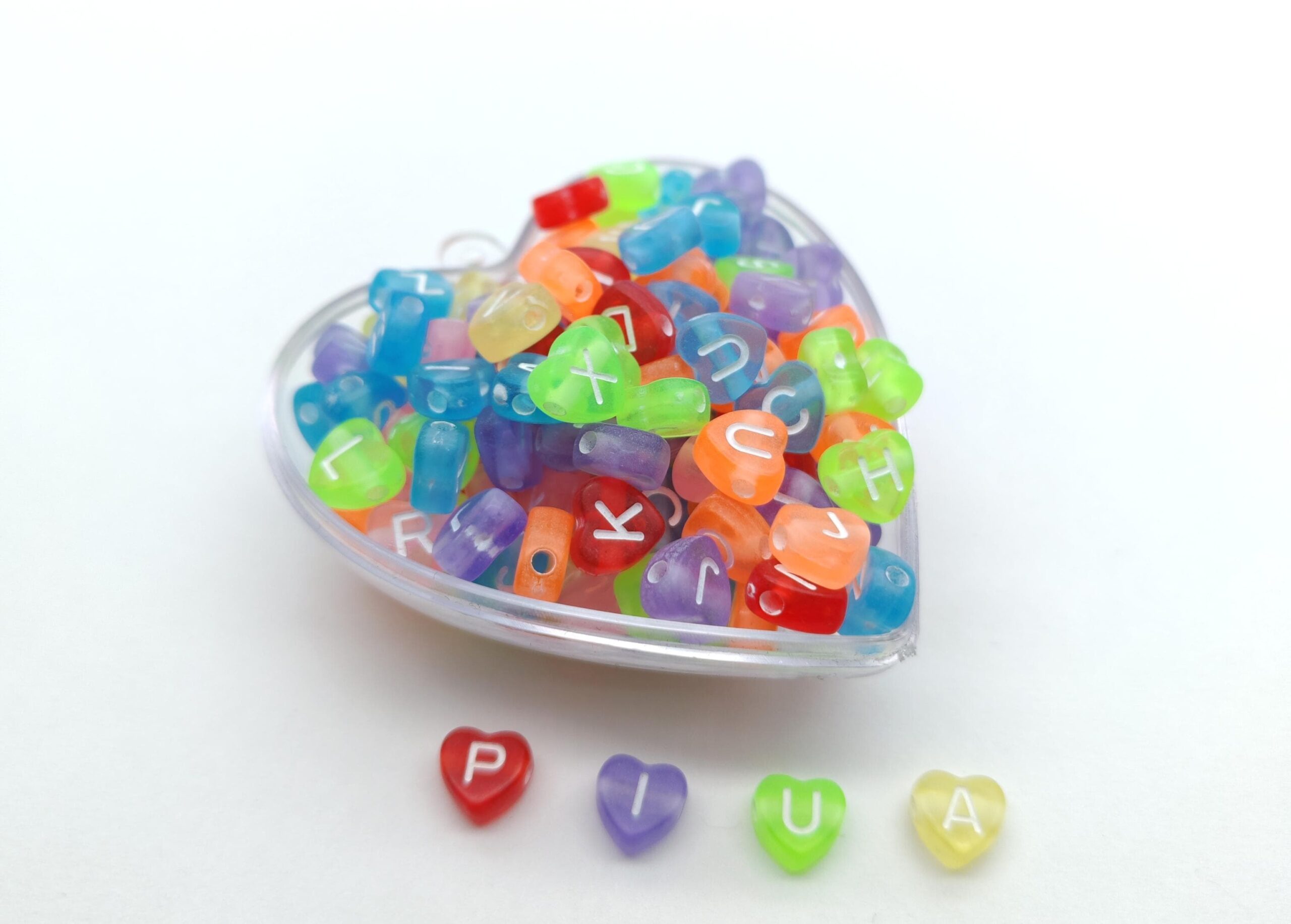Pastilla en forma de corazón con letra grabada en el centro. Ideal para pulseras, collares y accesorios personalizados.