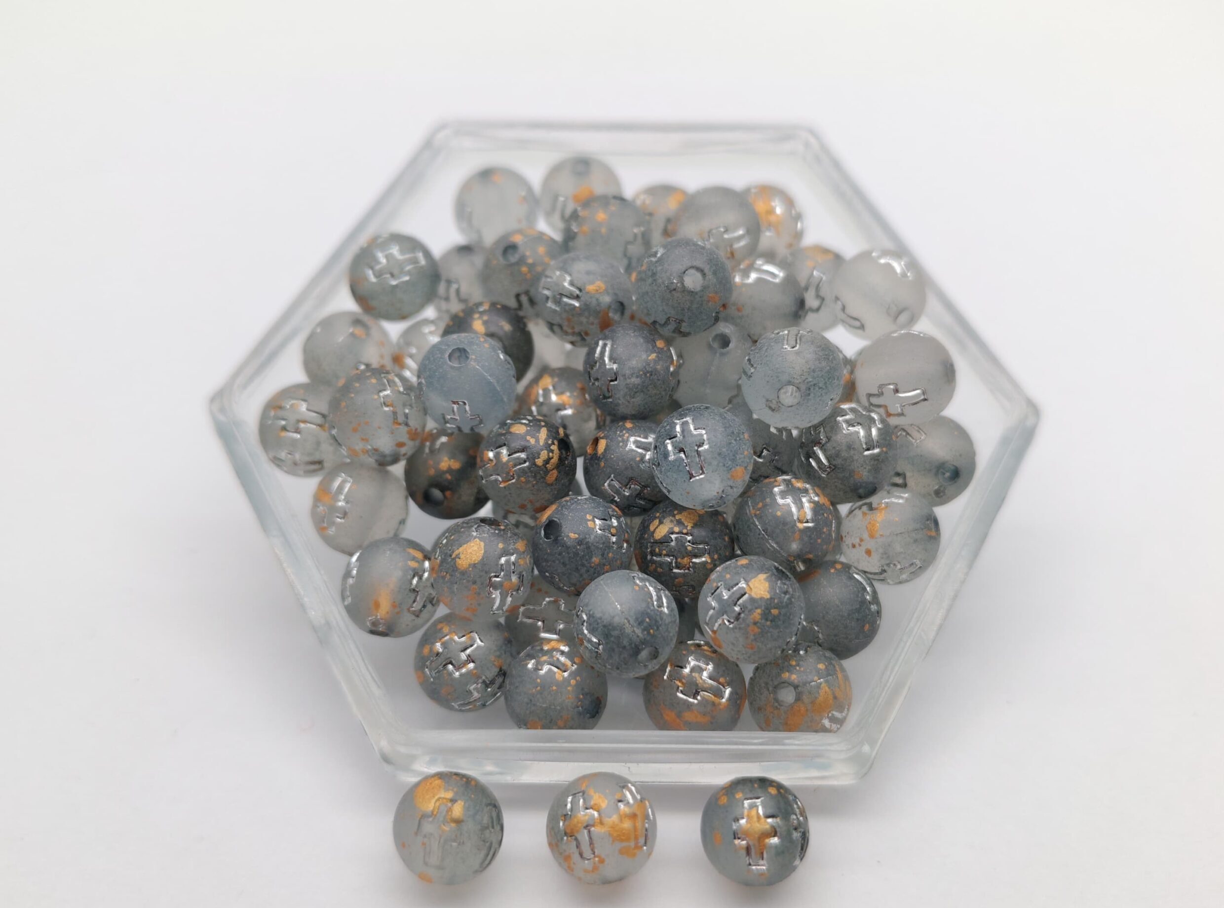 Pepa redonda de 8 mm con grabado de cruz. Ideal para rosarios, decenarios y accesorios religiosos.