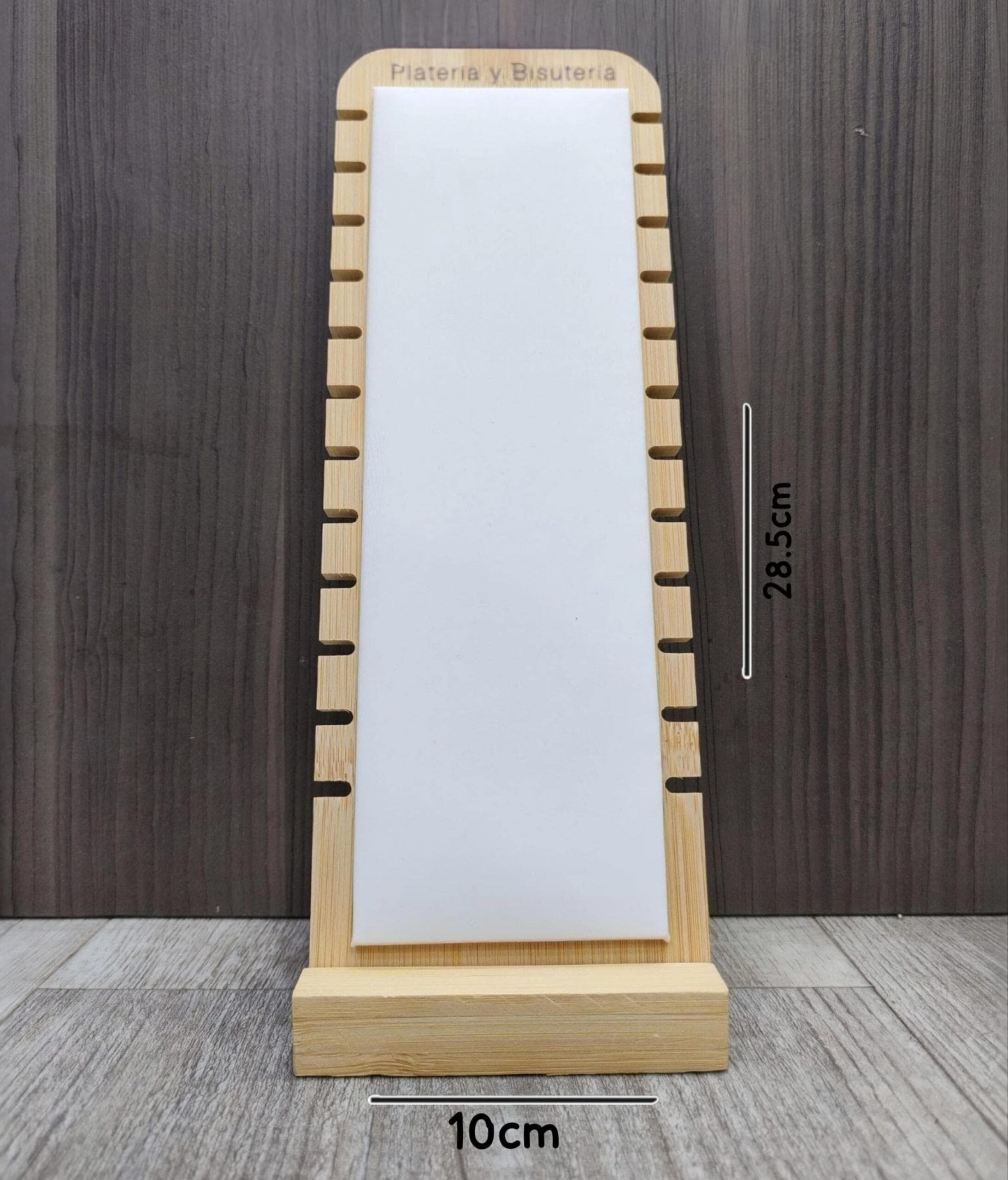Base de madera con acabado natural que realza la belleza de tus collares ideal para vitrinas y decoración.
